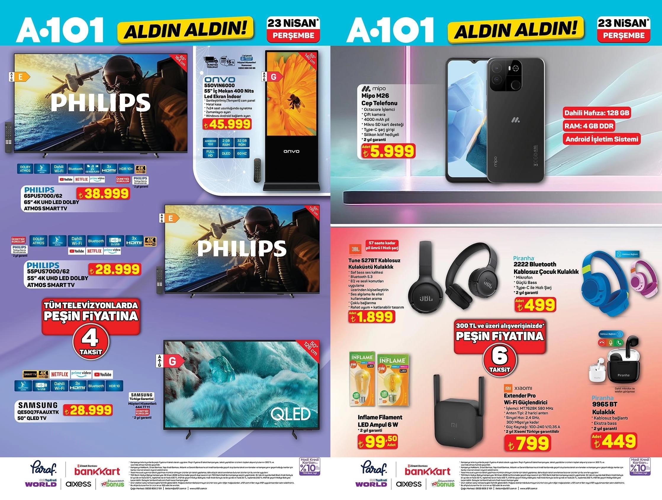 A101 marketlerin yeni hafta aktüel kataloğunda akıllı telefonlardan akıllı televizyonlara, kablosuz kulaklıklardan sinyal arttırıcılara ve elektrikli ev aletlerine kadar farklı teknolojik ürünler bulmak mümkün olacak. 23 Nisan A101 aktüel teknoloji ürünleri