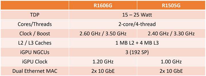 Bazı kaynaklar çözümün Ryzen 2 tabanlı olduğunu belirtse de 14nm üretim sürecine vurgu yapılması ilk neslin temel alındığını gösteriyor. Zaten V1000 çözümünden daha iyi olmadığı ifade edilmişti. Seride iki model var ve sadece saat frekansları biraz farklı. 15W-25W arasında değişen termal tasarım gücü fansız sistemlerde 12W seviyesine de inebiliyor.
