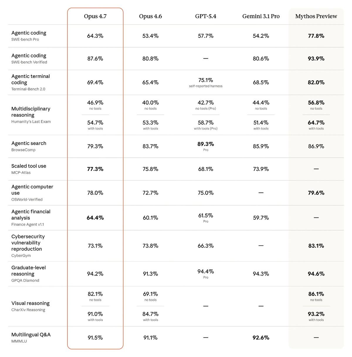 Yeni modelin özellikle geçmişte daha fazla destek gerektiren karmaşık kodlama alanlarında Opus 4.6’dan bir adım öteye geçtiği ifade edildi. Agentic kodlama görevlerinde %64.3’lük bir oran yakalamayı başarmış. Bu oran 4.6 modelinde%57,7, ChatGPT’ye güç veren GPT 5.4’te %57,7, Gemini 3.1 Pro’da %54,2. Ancak Opus’un üzerinde seviyede bir model olan Mythos Preview’dan geride olduğunu da belirtmek gerekiyor. Hatta çoğu testte ondan geride kalmış. Mythos’un güvenlik nedenleriyle sadece NVIDIA, Google, Microsoft, Apple gibi çok az sayıda şirkete sunulduğunu belirtmek gerek.