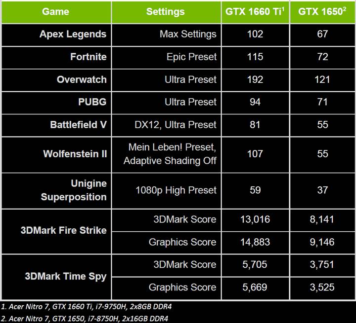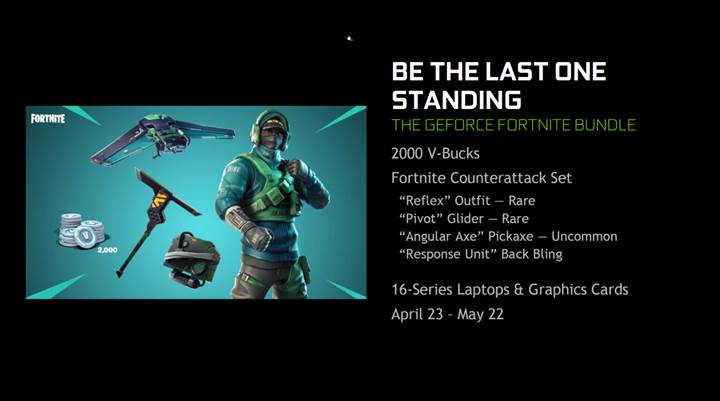 PUBG, APEX Legends, Overwatch ve Fornite gibi oyunlarda GeForce GTX 1660 Ti ekran kartının 100fps sınırını geçebileceği ifade ediliyor. Ayrıca tüm GTX 1600 ekran kartları ve dizüstü modellerinde Fortnite oyununda geçerli 2000 V-bucks ve çeşitli oyun içi eşyalar da hediye edilecek.