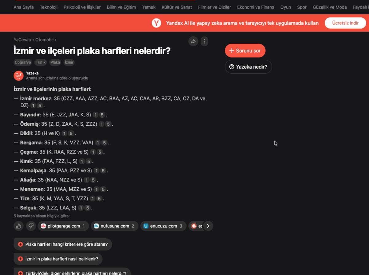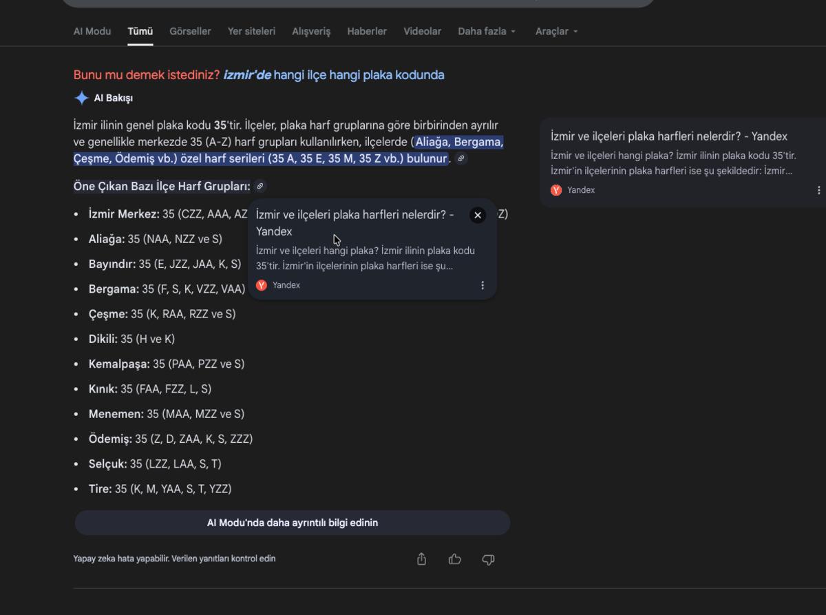 Paylaşılan örnekte kullanıcılar, “İzmir’de hangi ilçe hangi plaka kodunda?” şeklinde bir arama yaptığında Google’ın AI Bakış alanında bir yanıt görüyor. Ancak yanıtın kaynak kısmına bakıldığında, bu bilginin Yandex’ten alındığı anlaşılıyor.