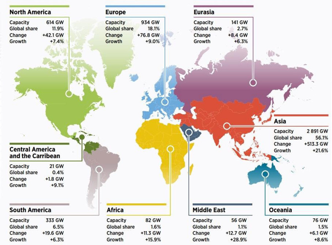Böylece Asya’nın toplam yenilenebilir enerji kapasitesi 2.891 GW’a ulaştı. Avrupa ise 934 GW toplam kapasiteyle ikinci sırada yer alırken, Orta Amerika ve Karayipler yalnızca 21 GW seviyesinde kalarak dikkat çekici biçimde geride kaldı.